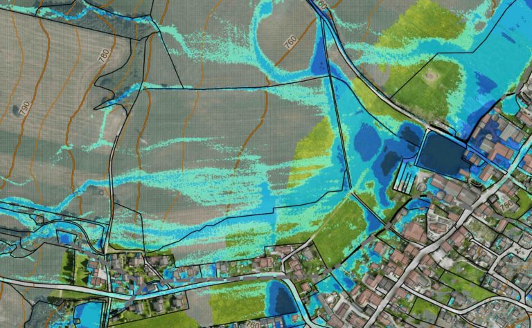 Für die Datenerhebung setzte RIWA für befestigte Flächen wie Straßen, Gebäude und Gräben auf klassische Vermessungstechniken über Sensoren, zum Beispiel tachymetrische oder GNSS-Vermessung. Für unbefestigte Flächen, beispielsweise Wiesen, kam hingegen eine Drohne zum Einsatz. In einer Flughöhe von etwa 100 Metern wurden 19 Hektar im Gemeindegebiet Apfeltrang beflogen. Aus den dadurch entstandenen hochaufgelösten und tagesaktuellen Luftbildern hat RIWA ein digitales 3D-Geländemodell erstellt – mit einer Bodenauflösung von 1,5 Zentimetern und einer Höhengenauigkeit von rund 3,5 Zentimetern. Diese Präzision ermöglicht es, auch kleinste Geländeunterschiede und bisher unbekannte Fließwege bei Starkregen sichtbar zu machen.