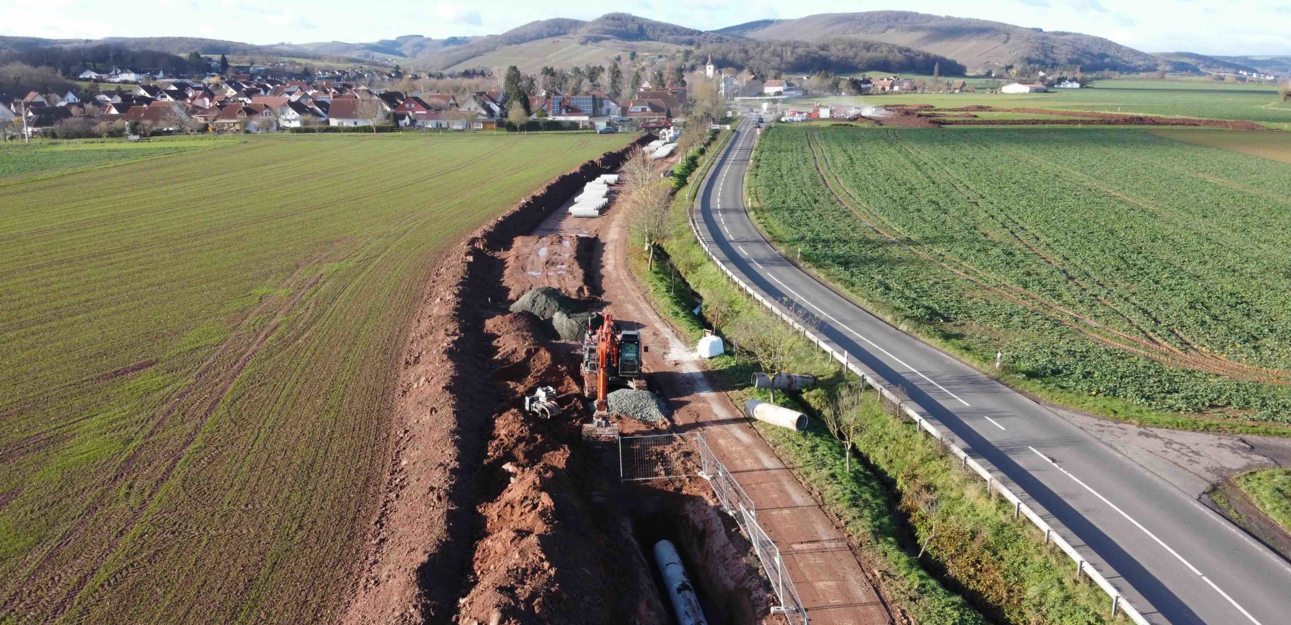 Nach sechsjähriger Planungszeit begannen im September 2024 die Erschließungsarbeiten für das Neubaugebiet „Unter dem Klarsteiner Pfad“ in der Ortsgemeinde Meddersheim im Landkreis Bad Kreuznach. Am nordöstlichen Siedlungsrand entstehen auf einer Fläche von 3,7 Hektar 39 Baugrundstücke. Die Entwässerung des Baugebietes erfolgt im Trennsystem. Aufgrund der besonderen Tiefenlage des zu errichtenden Kanalsystems, entschieden sich die Planer für den Einsatz von Stahlbetonrohren mit erhöhten Wandstärken für extreme Lastfälle.