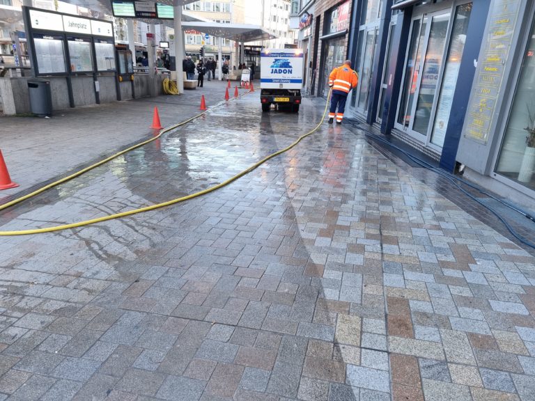 Der Jahnplatz ist mit schönen hellen Natursteinpflastern gepflastert, die allerdings schnell verschmutzten, was das Straßenbild alles andere als positiv beeinflusste – ein Ärgernis gerade für die an den Bushaltestellen wartenden Reisenden und die angrenzende Gastronomie. Nach mehreren erfolglosen Reinigungsversuchen führte schließlich Jadon einen Probeeinsatz durch und reinigte die Gehwege der am stärksten verschmutzten Haltestellen mit hervorragenden Ergebnissen. Im Anschluss daran hat die Stadt Bielefeld Jadon einen mehrjährigen Auftrag für die Reinigungspflege des gesamten Jahnplatzes erteilt. Die kommenden Jahre werden die belebten Verkehrsflächen häufig gereinigt, und der gesamte Platz einmal im Jahr generalgereinigt und von Kaugummis befreit. Ein schöner Auftrag, auf den Jadon stolz ist.