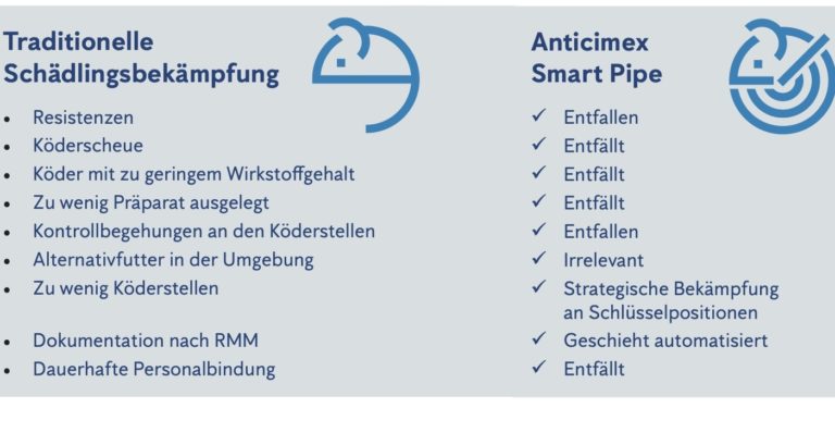 Wir arbeiten seit über 15 Jahren mit der Anticimex Smart Pipe, einer digitalen, vollautomatischen Schlagfalle. Bei diesem System werden keine Köder verwendet, wir werden der zukünftigen Gesetzgebung also voll gerecht.