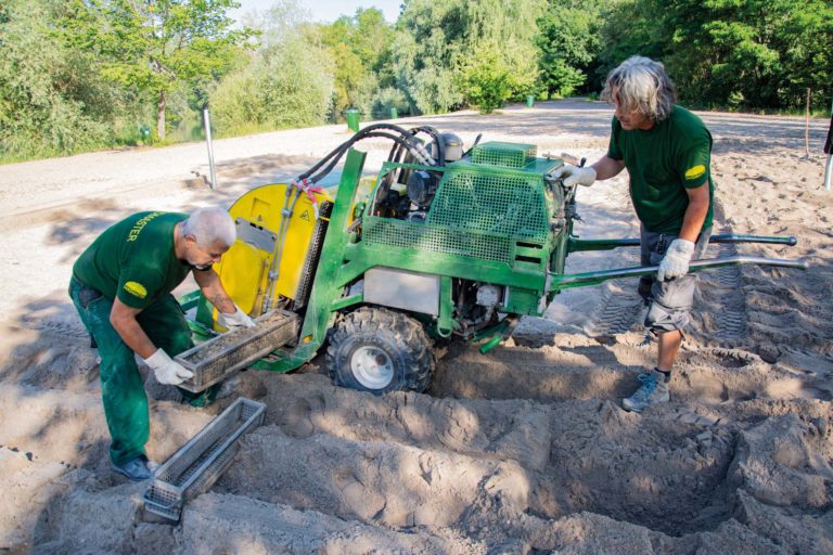 Hier ist jedoch Vorsicht geboten! Immer wieder liest man von Sandreinigungen, bei denen man offensichtlich die Reinigungstiefe auf die leichte Schulter nimmt und davon ausgeht, dass eine Reinigungstiefe von 15 bis 20 Zentimetern absolut ausreichend ist und alles andere gefährlich wäre, weil man den Unterbau beschädigen könnte. Das bekannte Sandmaster-Verfahren arbeitet hier sehr zuverlässig mit einer Reinigungstiefe von bis zu 40 Zentimetern, natürlich immer abhängig von der aktuellen Schütttiefe, die vorab geprüft wird. Denn auch und vor allem in den untersten Schichten findet man eine Konzentration von sogenannten Koli-Bakterien (Escherichia coli), den Darmbakterien. Dort finden sich vor allem anaerobe Stoffe, die keinen Sauerstoff benötigen und sich trotzdem vermehren. Durch die Belüftung werden diese negativen und gesundheitsschädlichen Bakterien auf natürliche Weise eliminiert.