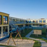 Die „Neue Käthe“ gilt übrigens als die modernste Kita der Region. 47 im ALHO-Werk vorgefertigte Module setzen sich zu 7000 Kubikmeter umbauten Raums zusammen. Und der hat es in sich: Mehr als 2000 Quadratmeter stehen auf zwei Etagen für das umfangreiche Raumprogramm zur Verfügung. Das L-förmige Gebäude mit 51 und 38 Metern Länge umschließt einen Außenbereich, der ausreichend Platz zum Spielen und Toben bietet.