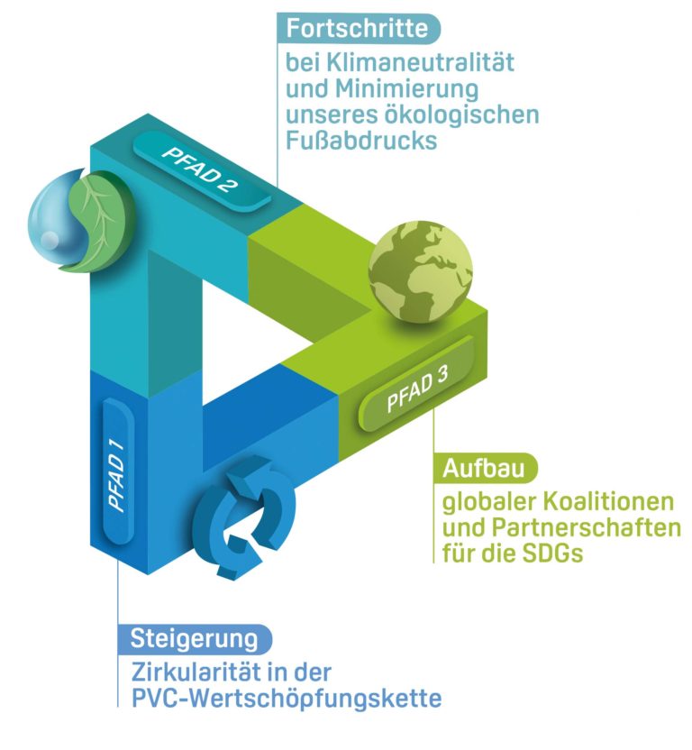 Mit der freiwilligen Selbstverpflichtung zur nach- haltigen Entwicklung der europäischen PVC- Branche, dem Programm VinylPlus®, steht das Recycling als Baustein einer funktionierenden Kreislaufwirtschaft seit vielen Jahren im Fokus ihres Handelns. Die Branche hat sich schon früh mit Recyclingthemen auseinandergesetzt und im vergangenen Jahr mit VinylPlus 2030 neue ehrgeizige Ziele festgelegt. Damit wird der im Jahr 2000 gemeinsam begonnene Weg konsequent fortgesetzt. Im Mittelpunkt des jüngsten Nachhaltigkeitsprogramms stehen drei Pfade mit insgesamt zwölf Aktionsfeldern: Sie umfassen die Kreislaufwirtschaft in der PVC-Wertschöpfungskette, ihren Fortschritt in Richtung Klimaneutralität und Minimierung des ökologischen Fußabdrucks der PVC-Produktion und -Produkte sowie ihr Engagement mit Interessengruppen und Partnern für die globalen Nachhaltigkeitsziele der Vereinten Nationen (SDGs).