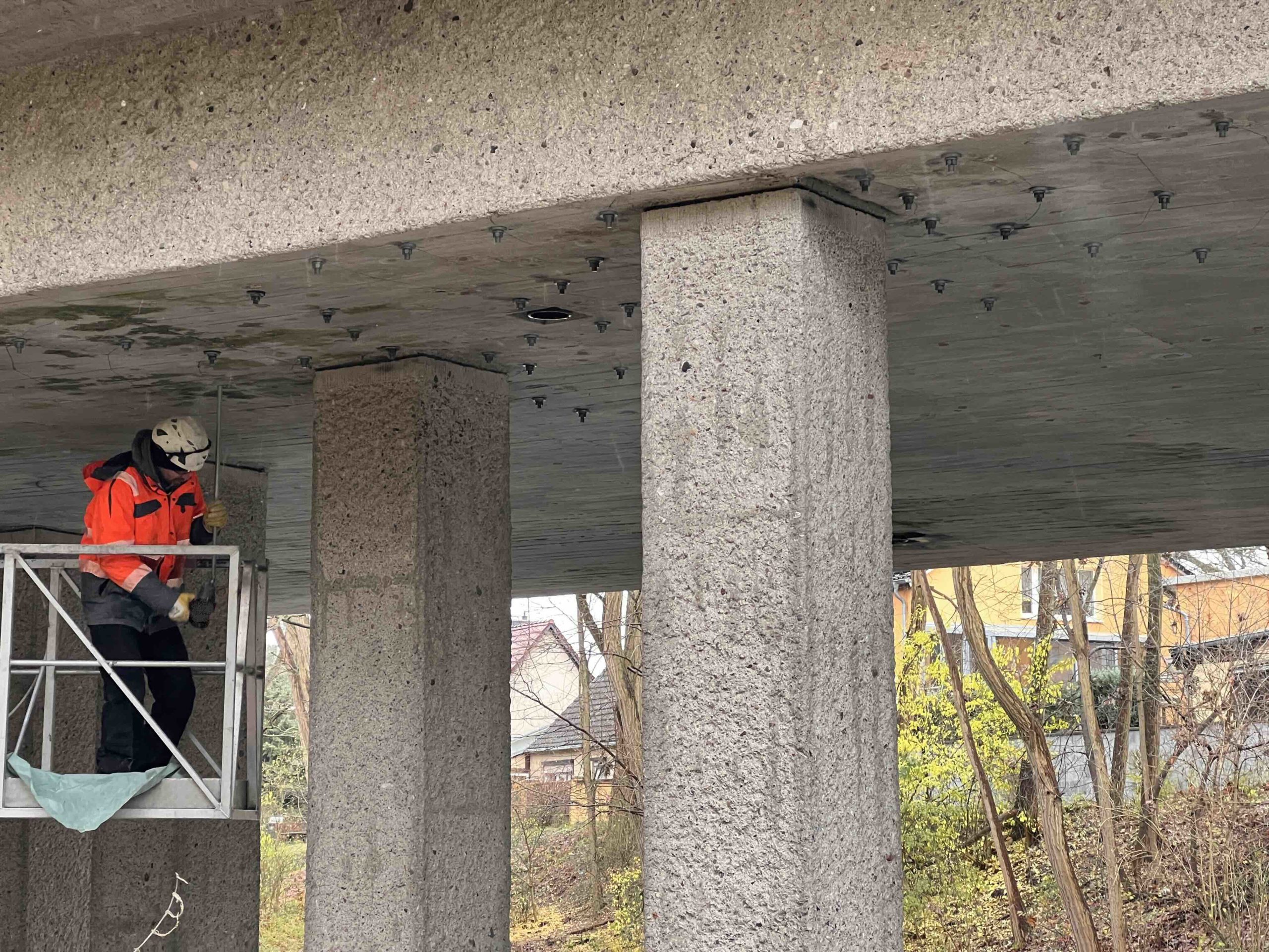 Bei der Nachrechnung der Brücke wurden Tragfähigkeitsdefizite festgestellt, da die vorhandene Bewehrung den aktuellen Normen nicht mehr entsprach. Zur Verstärkung wurden 230 RELAST® Verbundankerschrauben eingebaut. Die Montage erfolgte in kürzester Zeit mit einem Brückeninspektionsfahrzeug (Bild links), während der Verkehr ungestört auf der Brücke weiterlief. So wurden aufwendige Umfahrungen vermieden. Die Verstärkung erhöht zudem die Sicherheit bei einem möglichen Schiffsanprall und ermöglicht die Nutzung der Brücke als Umleitungsbauwerk für kommende Bauarbeiten.
