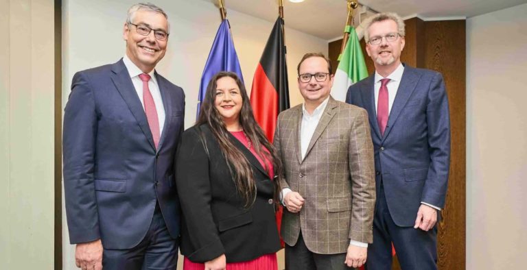 Foto: Verbandsratsvorsitzender Thomas Kufen (2.v.r.) mit dem neuen Vorstandsteam des Ruhrverbands: (v.l.) Prof. Norbert Jardin (Vorstandsvorsitzender und Vorstand Technik), Carolin-Beate Fieback (Vorständin Personal, Verwaltung und Soziales) und Christoph Gerbersmann (Vorstand Finanzen).