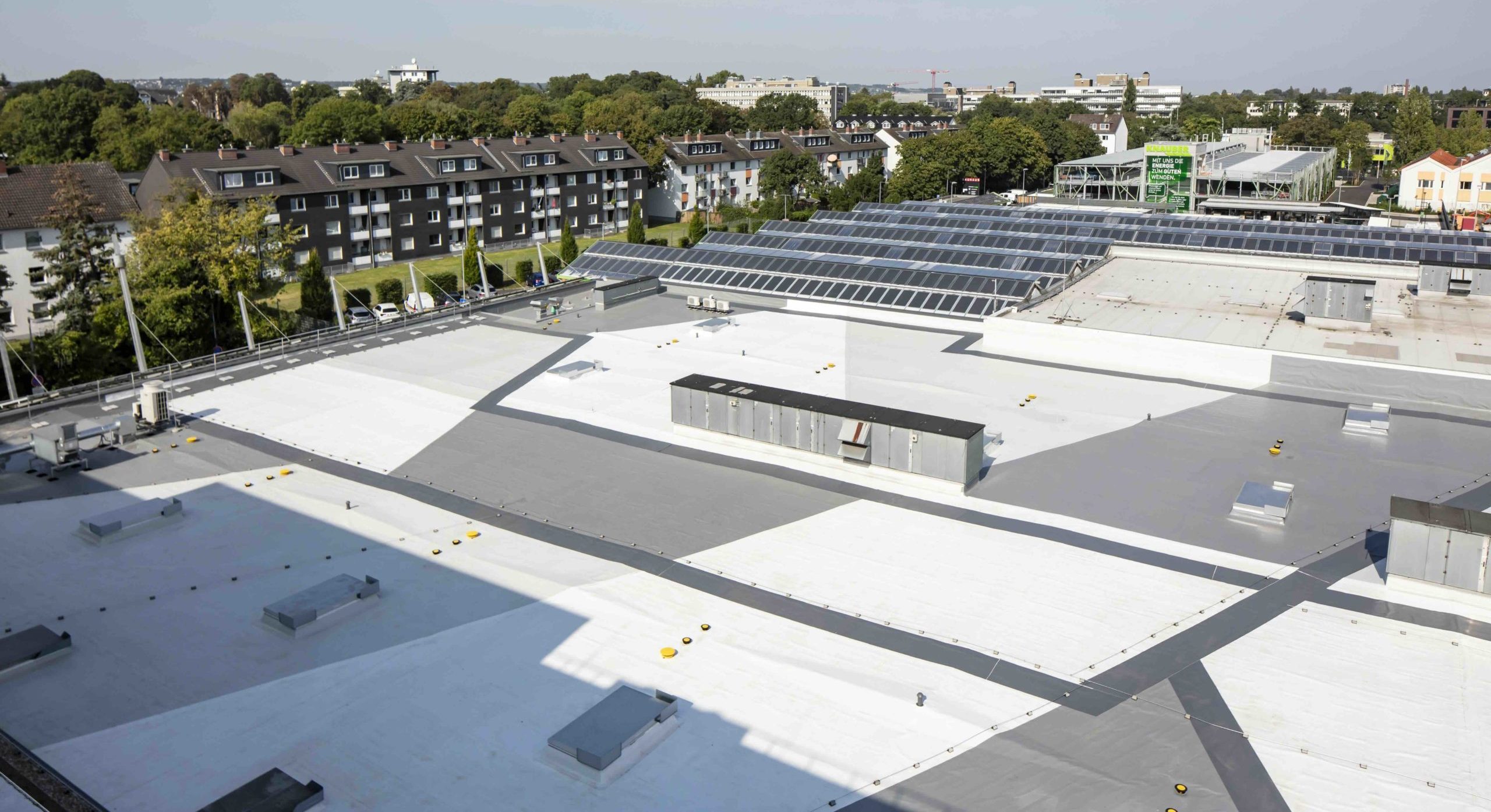 Bei der Sanierung eines Baumarkts in Bonn musste die Projektbeteiligten nachhaltige Lösungen für ein Dach mit geringer Tragfähigkeit finden. Dies wirkte sich unter anderem auf die Wahl der Dämmung und der PV-Module aus.