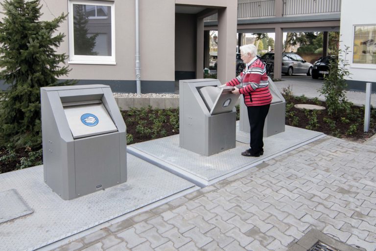 Hierbei handelt es sich um Produkte, mit deren Hilfe Mülltonnen und Müllgroßbehälter in die Erde versenkt werden. Die breite Produktpalette stellt dabei sicher, dass es zumindest eine Lösung für die je nach örtlichen Gegebenheiten verschiedenartigen Problemstellungen gibt. Die Mülltonnen stehen auf einer Plattform, die von einem elektrischen Antrieb angehoben und abgesenkt wird. Der Hebe- und Senkvorgang erfolgt über einen Schlüsselschalter, der aus Sicherheitsgründen (Sichtbereich) in unmittelbarer Nähe angebracht sein muss. Die Plattform stoppt automatisch in der Endstellung. Für die Befüllung der Abfallbehälter ist es aber nicht notwendig, die Plattform bis zur Endstellung hochzufahren – der Motor stoppt in jeder gewünschten Position. Ideal auch für Kinder und Rollstuhlfahrer. Eine Kombination mit einer vorhandenen Schließanlage ist möglich.