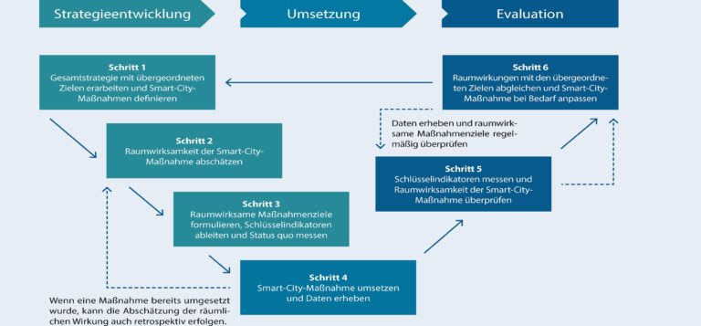 Kommunen können nach dieser Methode die Auswirkungen ihrer Maßnahmen auf den jeweiligen Raum als Wirkungsumgebung bewerten und geeignete Indikatoren zur Wirkungsmessung im Rahmen einer digital gestützten Stadt- oder Regionalentwicklung festlegen. Das Vorgehen ist praxisorientiert in sechs Schritten beschrieben: Von der Gesamtstrategie und Formulierung der messbaren Ziele über die Umsetzung von Maßnahmen bis hin zu deren Evaluation. Zudem ist es flexibel und kann auch für die Wirkungsmessung fortgeschrittener Maßnahmen eingesetzt werden.