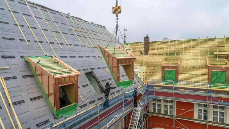 Die unkomplizierte Verarbeitung der Dämmung erwies sich in Dinkelsbühl auch deshalb als Vorteil, weil angesichts von zwölf neuen Gauben einiges an Zuschnitt und Detailarbeit anfiel. Die LITEC GBS Gauben wurden als Bausatz an Weha Bedachungen geliefert und dort zusammengebaut: „Linz-meier ist bei den Gauben für uns preislich ohnehin schon sehr interessant. Bei zwölf identischen Gauben ist das Preis-/Leistungsverhältnis dann so gut, dass eine Fertigung mit eigenen Mitteln erheblich teurer wäre.“