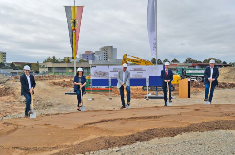 Mit dem symbolischen Spatenstich fiel der offizielle Startschuss für die Bauarbeiten des neuen Beruflichen Schulzentrums Alfons Goppel. Der BSZ-Neubau mit einem Investitionsvolumen von 53,7 Millionen Euro ist das bisher größte Bauprojekt, das der Landkreis Schweinfurt je realisiert hat. Die Inbetriebnahme des neuen Schulgebäudes ist pünktlich zum Schuljahresbeginn 2022/2023 geplant. Der nachhaltige und barrierefreie Ersatzneubau stammt vom Münchner Architekt Peter Schwinde, der diesen als städtebaulichen Anker- und Drehpunkt für das Schulareal entworfen hat. Das kompakte quadratische, viergeschossige Gebäude entsteht direkt neben dem alten nicht mehr zeitgemäßen BSZ-Schulgebäude in der Schweinfurter Geschwister-Scholl-Straße und wird laut Schwinde künftig einen markanten Endpunkt