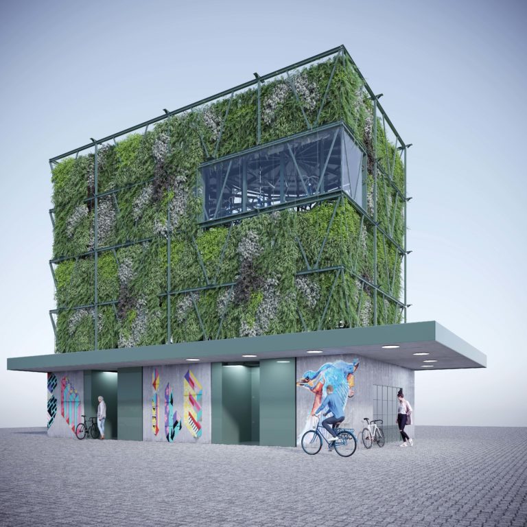 mehr ausladende E-Bikes gibt und auch Mountainbikes ständig in die Breite wachsen, bietet Wöhr jetzt auch einen Bikesafe für Räder bis 83 Zentimetern Lenkerbreite – ohne Kapazitätseinbußen. Den Bikesafe gibt es in einer Turm-, in einer Schacht- und Turm-Schacht-Mixvariante, bei der die Stellplätze teilweise unter der Erde liegen. Neben einer Standardfassade aus Aluminium-Lamellen bietet das Unternehmen auch eine Glasfassade an.