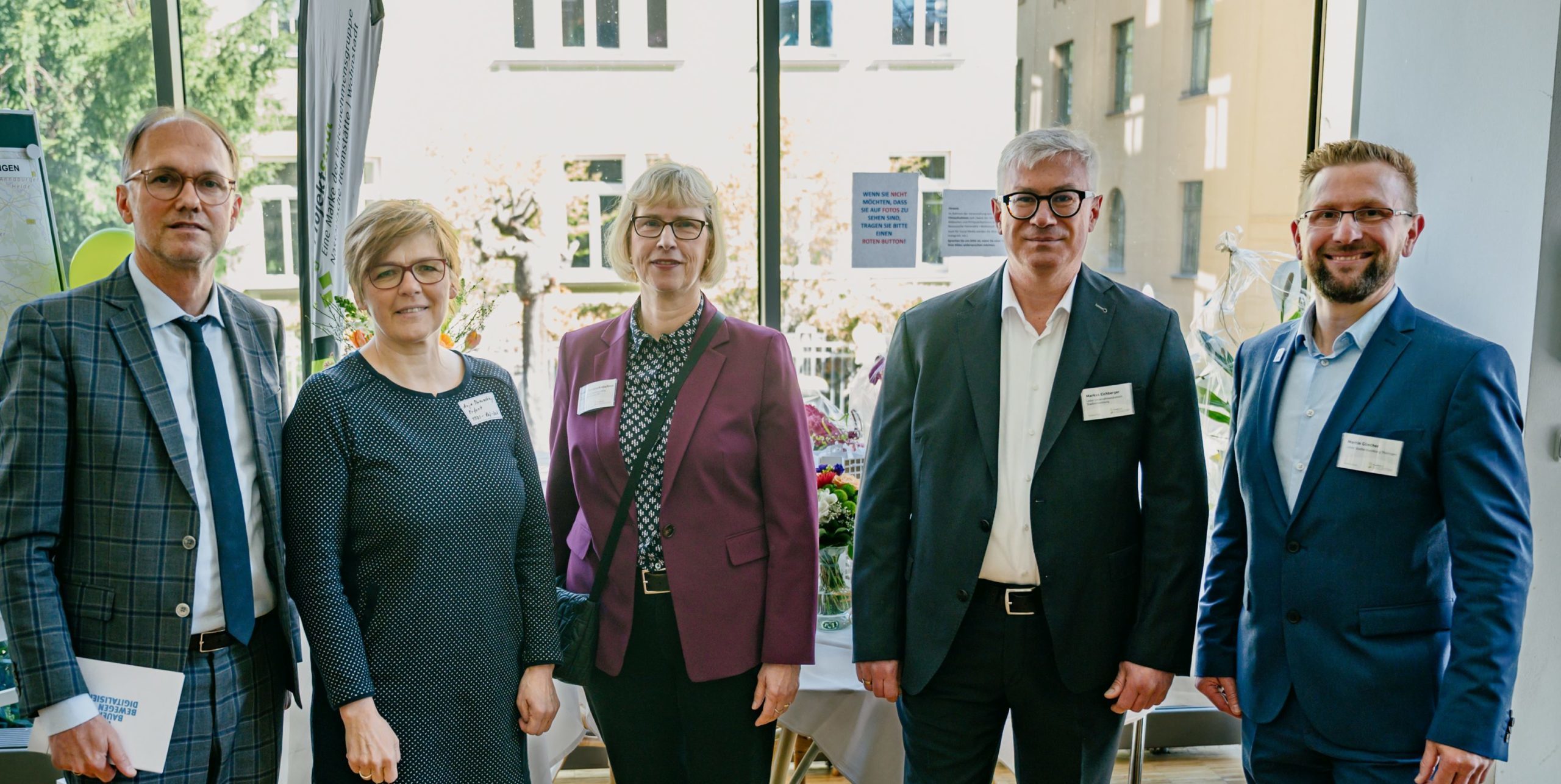 Foto: Tauschten sich intensiv aus: (v. li.) Dr. Tobias J. Knoblich, Staatssekretär im Thüringer Ministerium für Digitales und Infrastruktur, Anja Maruschky, Referatsleiterin für Städtebauförderung, Quartiersentwicklung und Schulbauförderung im Thüringer Ministerium für Infrastruktur und Landwirtschaft sowie von der NHW Geschäftsführerin Monika Fontaine-Kretschmer, Markus Eichberger, Leiter Unternehmensbereich Stadtentwicklung, und Martin Günther, Leiter Fachbereich Stadtentwicklung Thüringen. Foto: NHW / Henry Sowinski