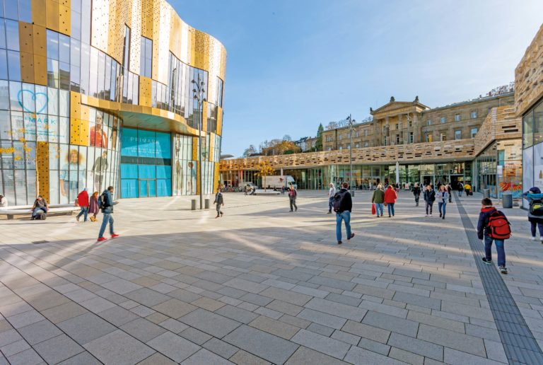 An die Befestigung der rund 7000 Quadratmeter großen Flächen stellten die Planer ganz besondere Anforderungen. Hierzu Andreas Klein: „Die Optik der Pflasterflächen sollte sich an der Natursteinkruste der Kalksteinfassade, die insbesondere die untere Platzebene umgibt, orientieren.“ Deshalb entschied man sich nach Anlegen von Musterflächen für das Modula-Plus-Pflastersystem aus dem Hause Berding Beton im Farbton Sandbeige. Insgesamt sechs Formate (30 mal 20, 40 mal 20, 60 mal 30, 80 mal 40, 50 mal 30 und 60 mal 40 Zentimeter) kamen hier zum Einsatz. Andreas Klein: „Verlegt wurden die Steine im wilden Reihenverband, alle sieben bis neun Reihen wird das Muster wiederholt. Mit dieser Oberflächengestaltung gelingt uns die gestalterische Verbindung der unterschiedlichen Flächen.“