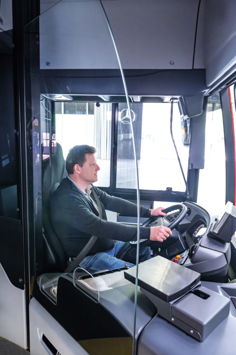 Fahrer von Stadtbussen gehören gerade in Zeiten der Covid-19-Pandemie zu den systemrelevanten Arbeitskräften: ohne ihren Einsatz ist der öffentliche Personennahverkehr (ÖPnV) nicht denkbar. Gleichzeitig sind sie durch den Kontakt mit zahlreichen Menschen einem erhöhten Infektionsrisiko ausgesetzt. Um Busfahrer vor Ansteckungen zu bewahren, bietet Mercedes-Benz jetzt für seinen Stadtbus citaro eine professionelle Nachrüstung durch Fahrerschutztüren mit Trennscheibe an. Seit 27. April sind Fahrgäste des ÖPNV in Deutschland zum Tragen eines Mund-Nase-Schutzes verpflichtet. Dies ist gleichzeitig ein erster offizieller Schutz auch von Busfahrern. Flatterbänder als Absperrung des Fahrerbereichs, geschlossene vordere Einstiegstüren, improvisierte Trennscheiben – Verkehrsunternehmen haben nach Ausbruch der Corona-Pandemie schnell reagiert, um ihre Busfahrer vor Infektionen zu schützen. Dies aber sind keine Dauerlösungen.
