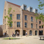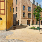 Architektur der Häuser und des Platzes. Zentrales Gestaltungselement sind Hagemeister-Pflasterklinker. Die sandgelbe Sortierung „Elba“ setzt sich von der klassischen Verwendung der sogenannten Odense Klinker, die überall in der Stadt zu sehen sind, ab. Die Sortierung ergänzt sich gut mit der alten grauen Kopfstein-Pflasterung, die in Teilen des Platzes immer noch zu finden ist, und schafft so eine