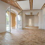 Der Klinker setzt sich zudem im Erdgeschoss eines der beiden neu gebauten Gebäude fort und leitet so die Besucher und Bewohner ins Innere. Auf diese Weise verschmelzen Außen- und Innenraum miteinander und der Raum erscheint größer. Die Verlegung erfolgte zum Teil im Fischgrätverband, was dem Platz eine besonders lebhafte Optik und hohe Stabilität verleiht. Ausgeprägte Rundformen schließen an die alte bestehende Pflasterung an. Die ausgewählten Pflasterklinker interpretieren so die Verbindung zwischen Vergangenheit und Gegenwart auf eine ganz neue Art und Weise.