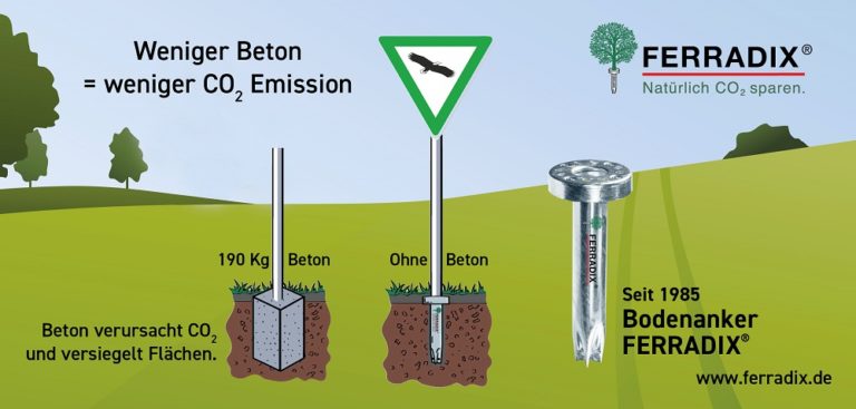 Schilder, Bänke und Zäune werden auch heute noch überwiegend mit Beton befestigt. Bei dieser sehr arbeitsintensiven Methode werden bis zu 190 kg Beton in vorher aufwendig gegrabenen Löchern versenkt.Das ist anstrengend, teuer und der benötigte Beton verursacht mehr als 14.000 g CO2-Emissionen. Das entspricht in etwa den Emissionen von 150 gefahrenen PKW-Kilometern, für ein einziges Fundament! Die Lösung: Die komplett betonfreie Montage mit dem Ferradix Alpha spart mehr als 14.200 g CO2 ÄG. (von der Prüfungsgesellschaft Dekra validiert). Geeignet für Naturböden, Schotter und sogar Asphalt. Und für Beton und Pflaster wurde jetzt neu der Betonspardübel Ferradix City entwickelt, er spart bis zu 80 Prozent Beton und somit mehr als 11.000 g CO2 gegenüber den herkömmlichen Betoniermethoden. Neu sind auch die betonfreien Zaunfundamente der Serie Country – die ideale Lösung, um Zäune betonfrei und kostengünstig stabil zu befestigen.