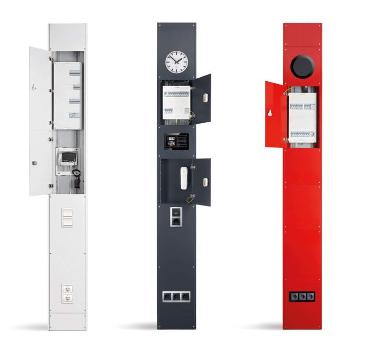 Robustes und optisch ansprechendes Design. Das Gehäuse der 400 Millimeter breiten, 150 Millimeter tiefen und raumhohen Mediensäulen besteht aus Aluminium und widerstandsfähigem Stahlblech. Abschließbare Türen schützen die Installation vor Vandalismus und unbefugtem Zugriff. Die farbliche Außengestaltung der Säulen ist aus der gesamten Palette der RAL-Farben frei wählbar, sodass eine harmonische Integration in alle räumlichen Gestaltungskonzepte möglich ist. Die Installation kann wahlweise auf der Wand erfolgen, teilintegriert oder flächenbündig in der Wand.